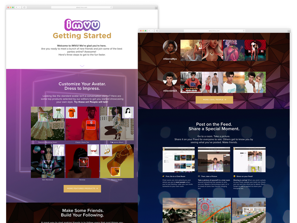The new Web site was a way to tease prospective users, using a familiar visual language, but coupled with a fantastic set of visuals that were created within IMVU for an authentic picture of the app experience.